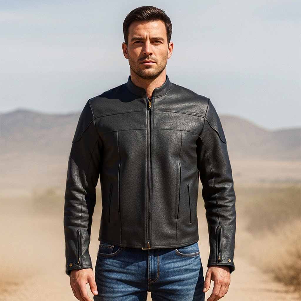 RIDERACT® Mens Leather Motorcycle Jacket made with durable, top quality cowhide leather in black for a rugged, long lasting exterior that provides superior protection and a sleek classic appearance. This Moto jacket is a high quality YKK® zipper with an antique finish, adding a vintage touch while ensuring smooth, reliable closure. Whether hitting the open road or cruising through the city, This mens motorcycle jacket ensures you’re ready for any adventure.