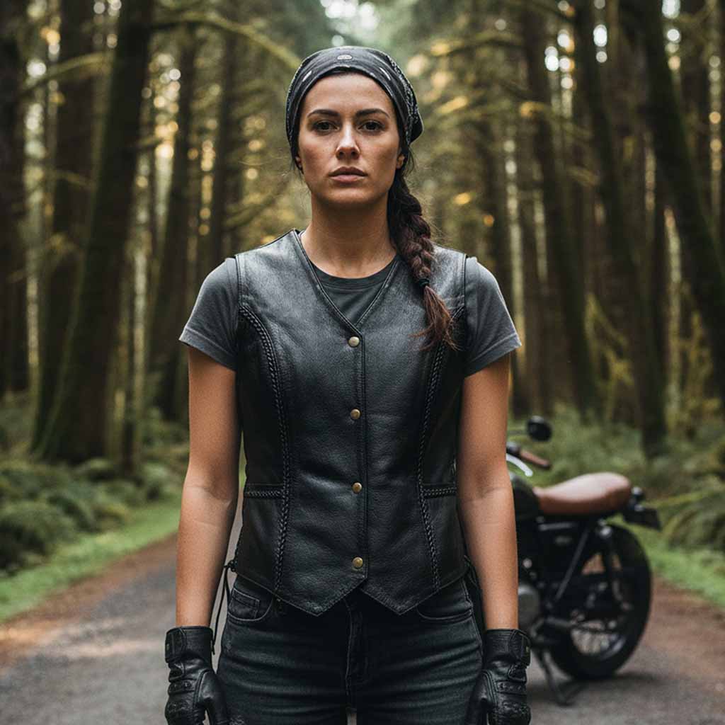 RIDERACT® Womens Leather vest motorcycle in black Patsy offers a classic and elegant design tailored for women riders who appreciate style and function. Our ladies biker vest is constructed from premium cowhide leather and with the classic look with a chic braided design and fashionable artwork accents. The scoop neck and antiqued press stud fastening in a patsy ladies leather vest create a sleek look and perfect choice for women bikers looking to flaunt their biker spirit on the road.