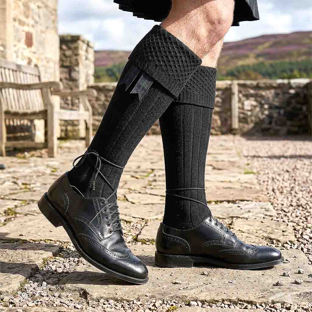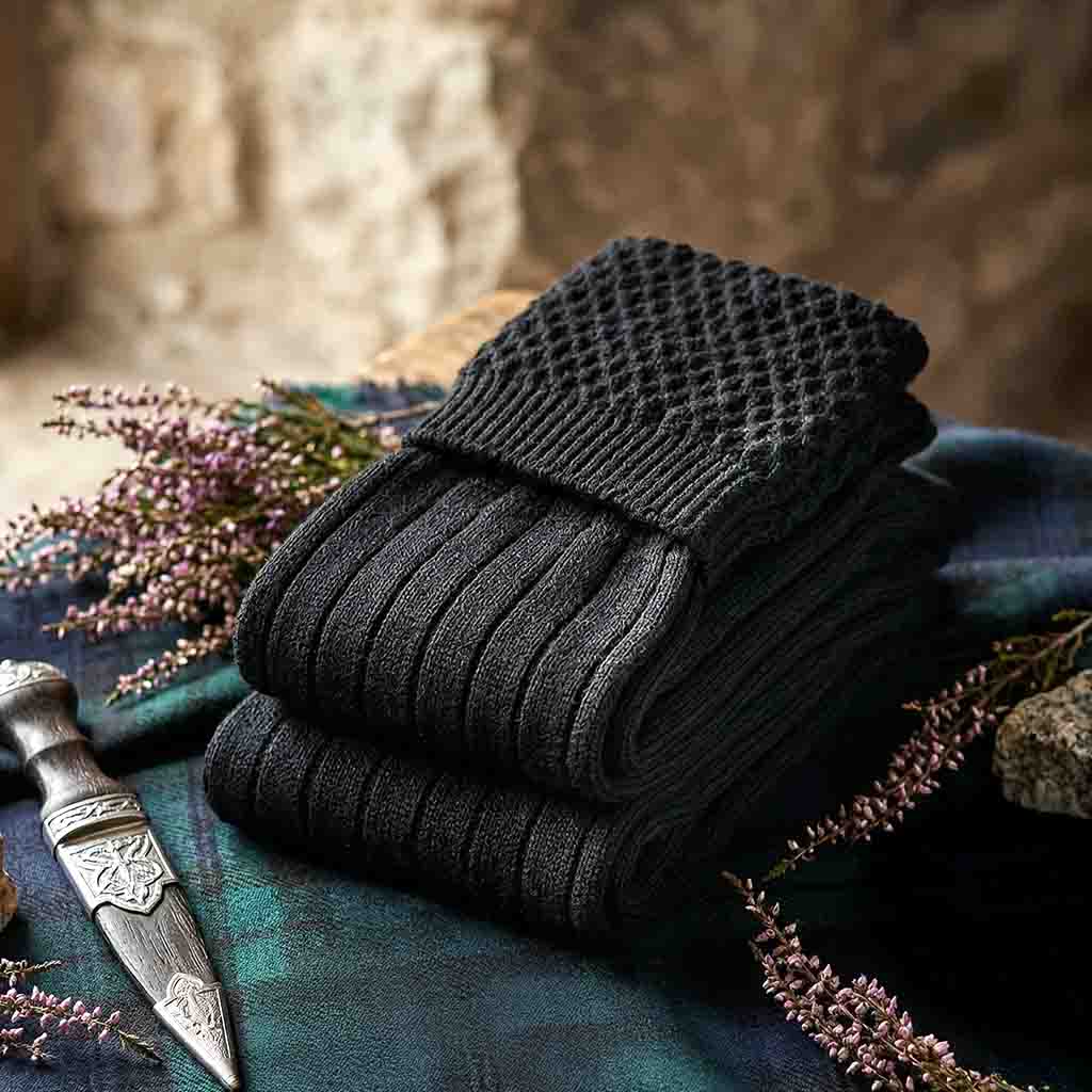Highland Kilt lover's tradition hose in black color, honeycomb top design, long length to cover your knee or simply fold as desired.