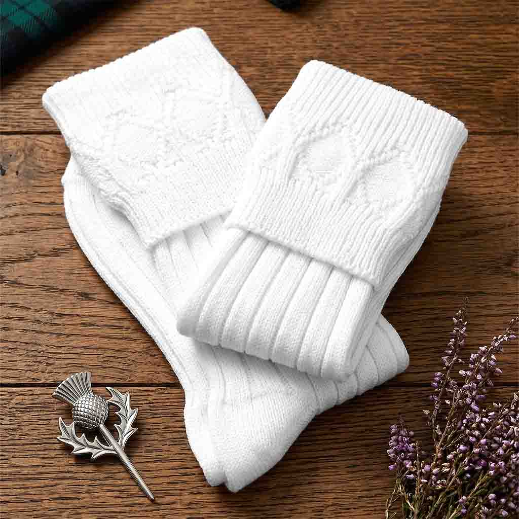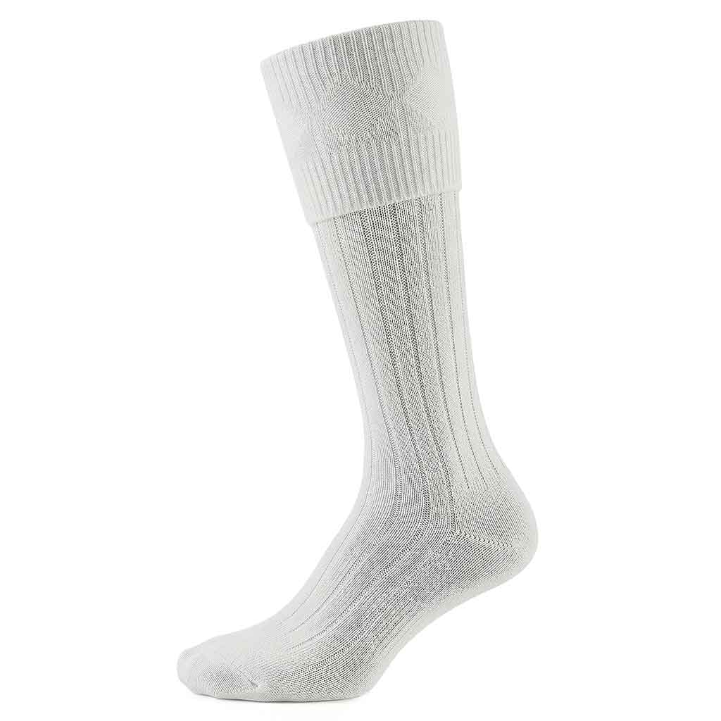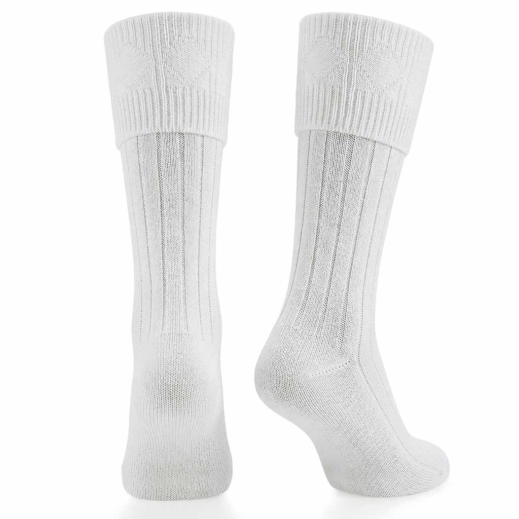 Highlander traditional long socks in semi white color to wear with your choice of Kilt outfit, wool blend, long style to complete your highland kilt outfit.