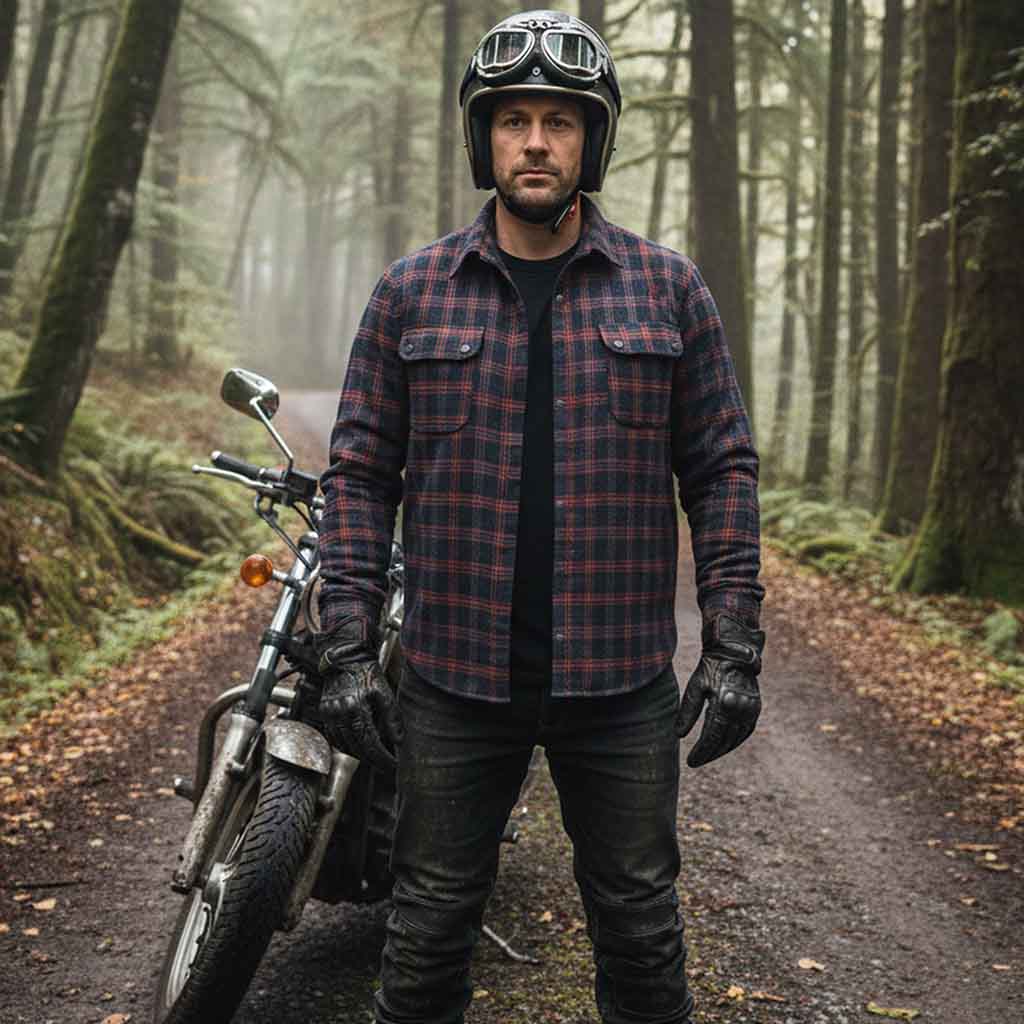 RIDERACT® Men’s Flannel Motorcycle Shirt features a sleek dark blue, black, and red checkered design. Lightweight yet protective, this motorcycle riding shirt delivers comfort, safety, and timeless style—making it the ideal summer alternative to a bulky flannel motorcycle jacket.