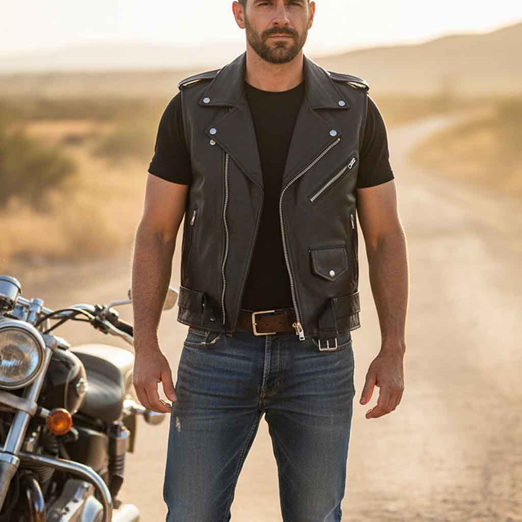 RIDERACT® Mens leather motorcycle vest is a timeless staple, inspired by the iconic Marlon Brando sleeveless biker vest, Designed for modern road warriors, this motorcycle vest blends classic rebellion with everyday functionality — making it a bold, reliable choice for riders who demand both durability and authentic biker style. Expertly crafted from 1.2mm top-grade cowhide leather, this rugged motorcycle vest features a sharp black finish, heavy-duty YKK® zippers, and a cut that’s made to move. Whether you’re layering it over a hoodie or rocking it solo on warm-weather rides, this leather biker vest delivers comfort, street-ready performance, and unmistakable attitude.