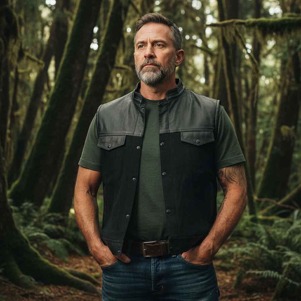 The RIDERACT® Denim motorcycle vest merges rugged durability with modern biker aesthetics. Crafted from genuine cowhide leather and abrasion-resistant denim, this biker vest offers dependable protection while delivering a bold, street-smart look that works both on and off the bike. Whether you're gearing up for a long-distance motorcycle ride or upgrading your everyday style, this motorcycle vest delivers on all fronts—versatility, comfort, and classic biker attitude. From open highways to urban commutes, ride with confidence in a denim Biker vest built to perform and styled to impress.